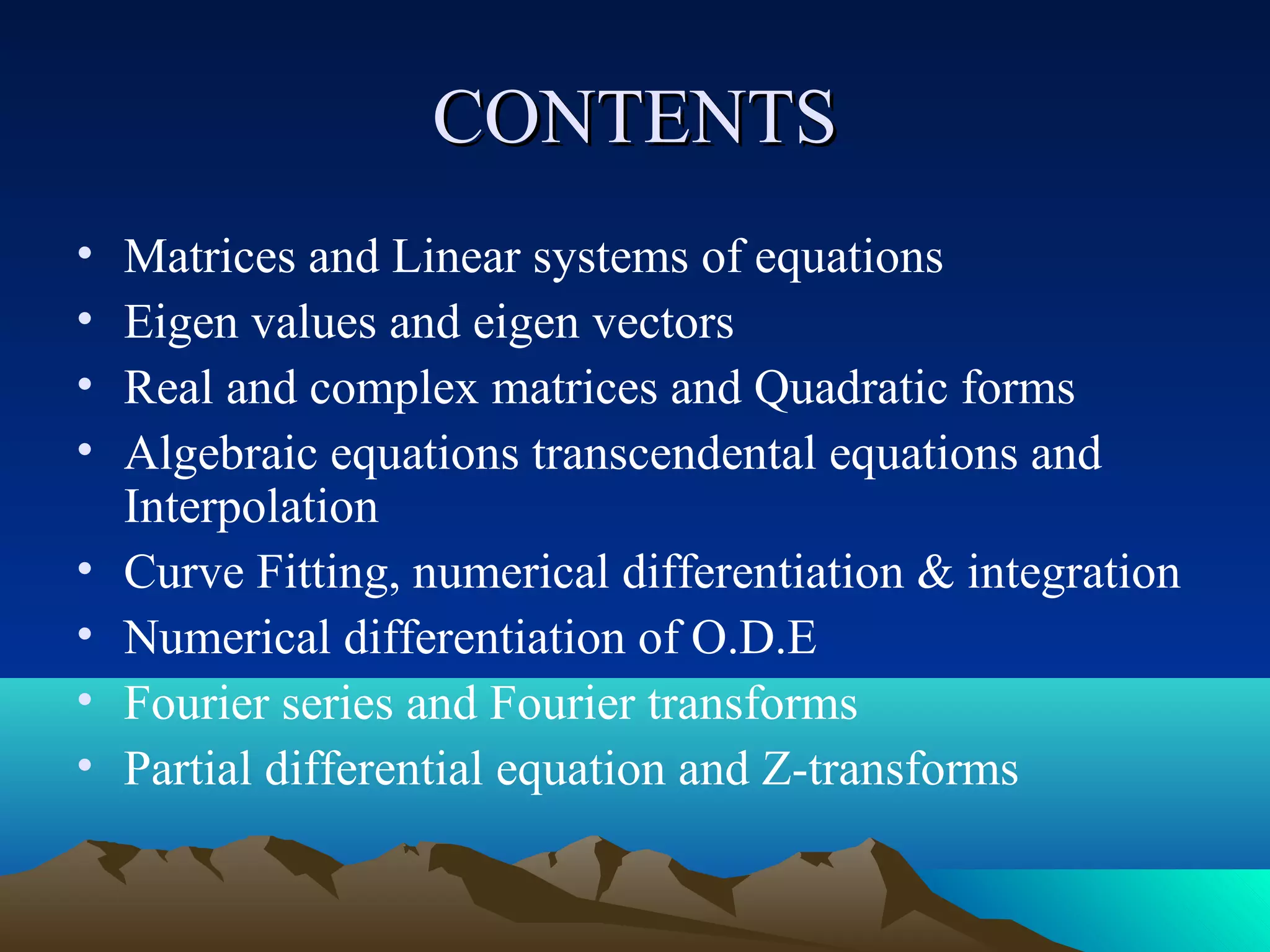 The document discusses various mathematical methods including matrices, eigen values, quadratic forms, algebraic and transcendental equations, interpolation, curve fitting, numerical differentiation and integration, Fourier series and transforms, and partial differential equations. It provides the contents, recommended textbooks and references for further study on these topics which are important for engineering applications.