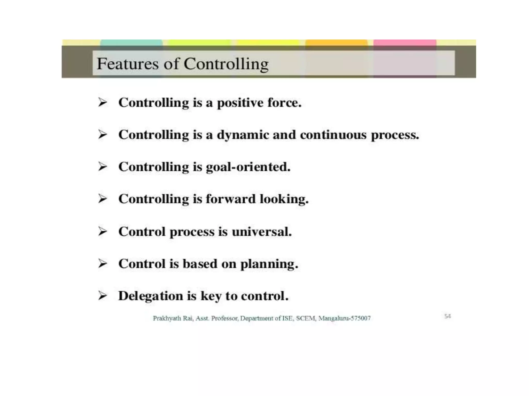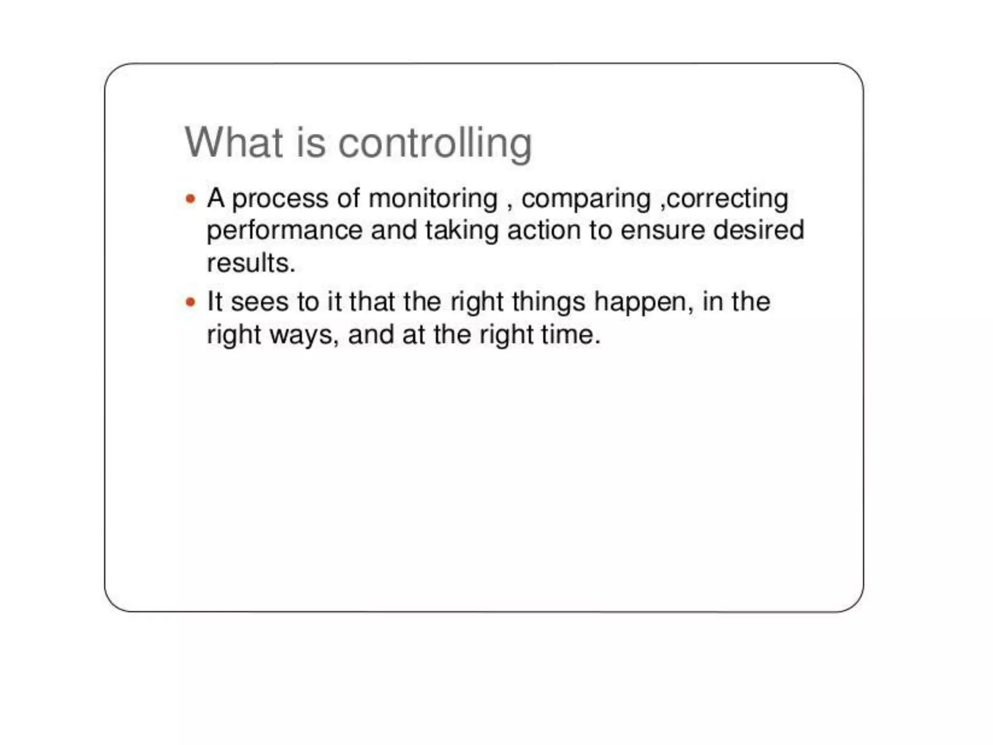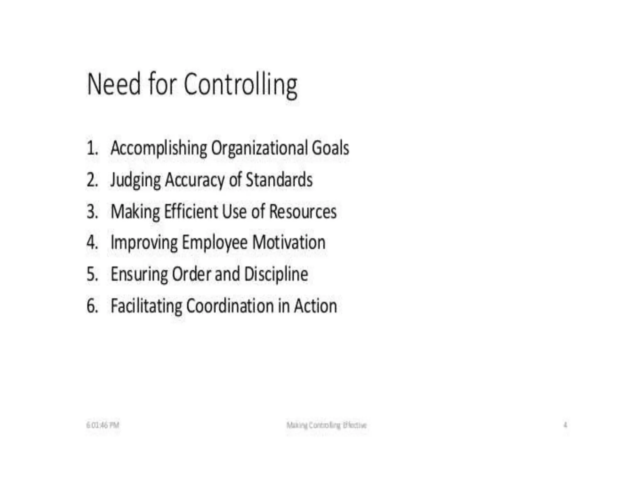 The document discusses various aspects of controlling processes including establishing standards, measuring performance against standards, and correcting variations. It outlines different types of standards such as physical, cost, capital, revenue, program, intangible, and goals. Key controlling techniques involving budgets, statistical data, reports, audits, and modern techniques like PERT, CPM, and Gantt charts are also summarized. Information technology plays an important role in controlling through systems like MIS, intelligent services, computers, and digital technologies like e-commerce.