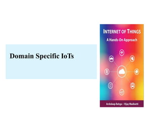 This document outlines various applications of IoT across different domains including home automation, cities, environment, energy, retail, logistics, agriculture, industry, and health & lifestyle. It provides examples of how IoT can be used in each domain such as using sensors and devices to monitor homes, infrastructure, environmental conditions, energy systems, inventory levels, fleet tracking, agricultural processes, machine operations, and individual health and fitness. The goal is to collect data from distributed sensors and devices to provide insights, automation, and alerts to improve processes and operations in each sector.