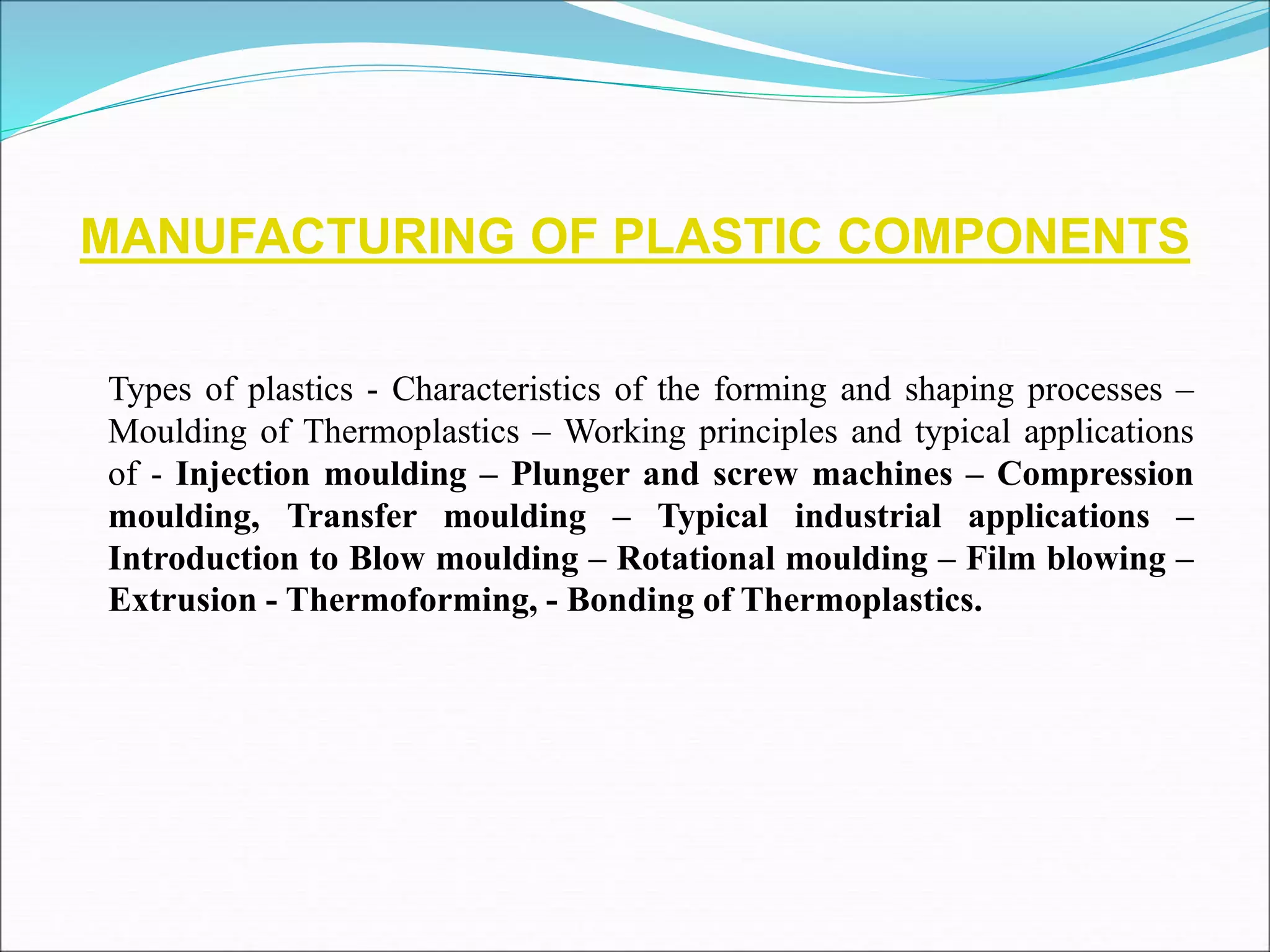 The document discusses various topics related to plastics manufacturing including types of plastics, polymerization processes, properties of thermoplastics and thermosets, and common shaping processes. It describes how thermoplastics can be softened by heat and reshaped, while thermosets undergo a chemical change and maintain their shape after heating. Common industrial manufacturing techniques for plastics are also summarized, such as injection molding, blow molding, rotational molding, extrusion, and thermoforming.