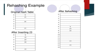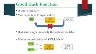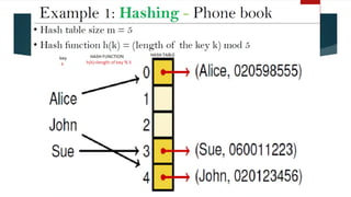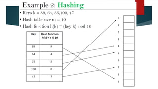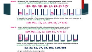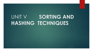 The document covers various sorting and hashing techniques, including linear search, binary search, merge sort, quick sort, insertion sort, selection sort, shell sort, and radix sort, detailing their algorithms and applications. It also discusses hash functions and collision resolution methods like separate chaining and open addressing. Lastly, it touches on the use of sorting in applications such as searching, government organizations, and load-balancing problems.