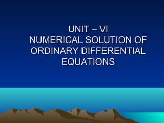 This document provides an overview of numerical methods for solving ordinary differential equations. It outlines several numerical methods including Taylor's series method, Picard's method of successive approximation, Euler's method, modified Euler's method, Runge-Kutta methods, and predictor-corrector methods like Milne's method and Adams-Moulton method. Examples of the formulas used in each method are given. The document also lists references and provides context about the course and unit.