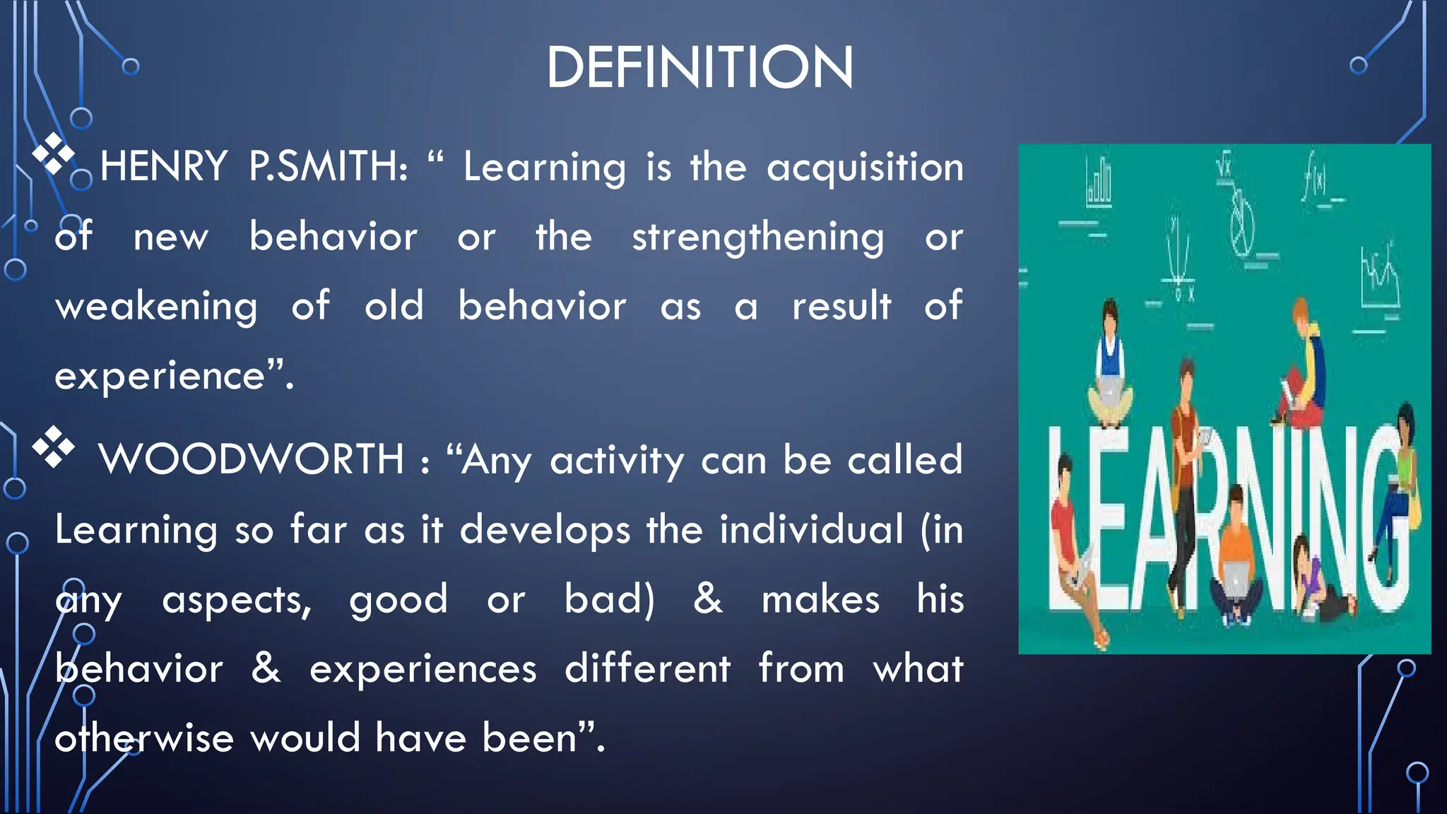 LEARNING- DEFINITION, CONCEPT OF LEARNING, NATURE OF LEARNING, TYPES OF LEARNING, LAWS OF LEARNING, EFFECTIVE WAYS OF LEARNING, THEORIES OF LEARNING,