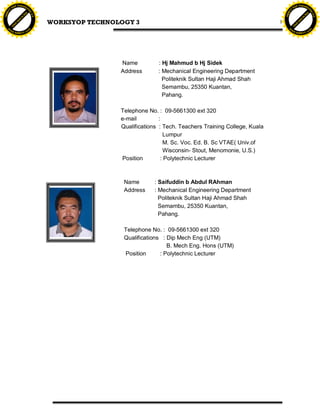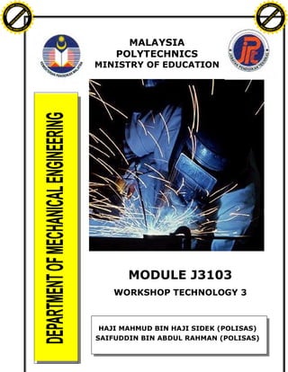 This document provides information about a module on Workshop Technology 3 taught at a Malaysian polytechnic. It lists the module code as J3103 and provides contact information for the two lecturers, Haji Mahmud bin Haji Sidek and Saifuddin bin Abdul Rahman. Both lecturers teach at the Politeknik Sultan Haji Ahmad Shah polytechnic and have qualifications in mechanical engineering.