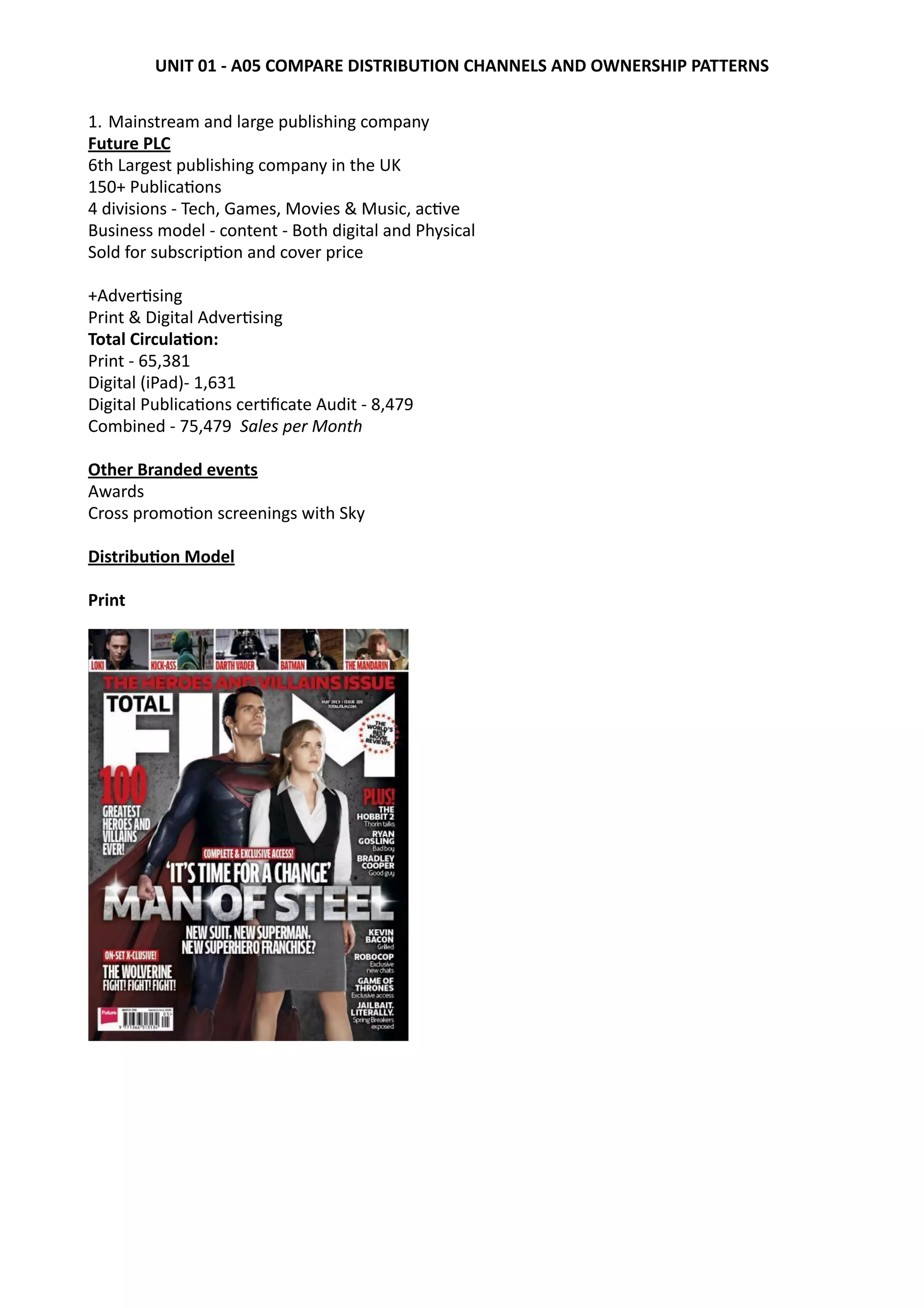 The document compares the distribution channels and ownership patterns of three different types of publications. Future PLC is a large mainstream publishing company that owns over 150 publications across four divisions. It distributes content both digitally and physically and generates revenue from subscriptions, cover prices, and advertising. Little White Lies is independently published bi-monthly and focuses on film. It is distributed physically in select stores and online to promote the publisher's creative agency business. Sight and Sound is published by the British Film Institute to document and promote British cinema. As a non-profit, it is distributed mainly through subscription and select newsstands to fulfill its educational mission.