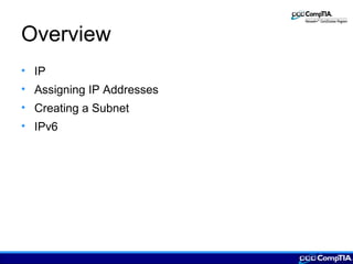 This document provides an overview of IP addressing concepts including assigning IP addresses, creating subnets, IPv4 and IPv6 addressing, and TCP/IP protocols. Key topics covered include the classes of IP addresses, dotted decimal notation, subnetting, public and private IP addresses, protocols like ICMP, ARP, RARP, DHCP, Telnet, and FTP.