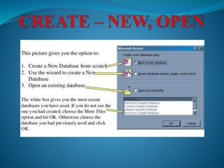 Microsoft Access is a relational database management system designed for home and small business use. It allows users to create and manage databases with tables to efficiently store data about different topics only once and reduce errors. Users can create tables with fields and data types, forms to graphically represent and manipulate table data, and reports to present that data in a printed format tailored to their needs.