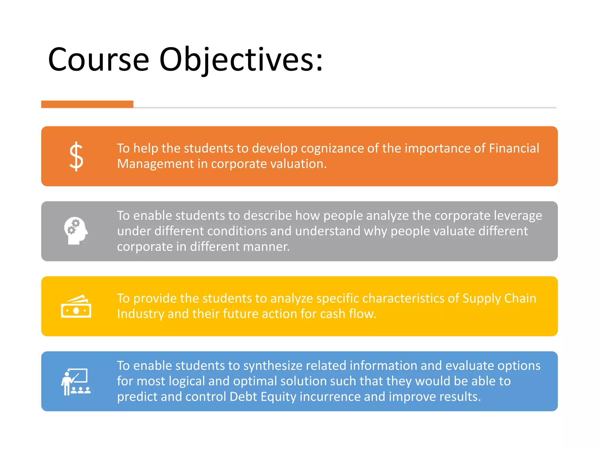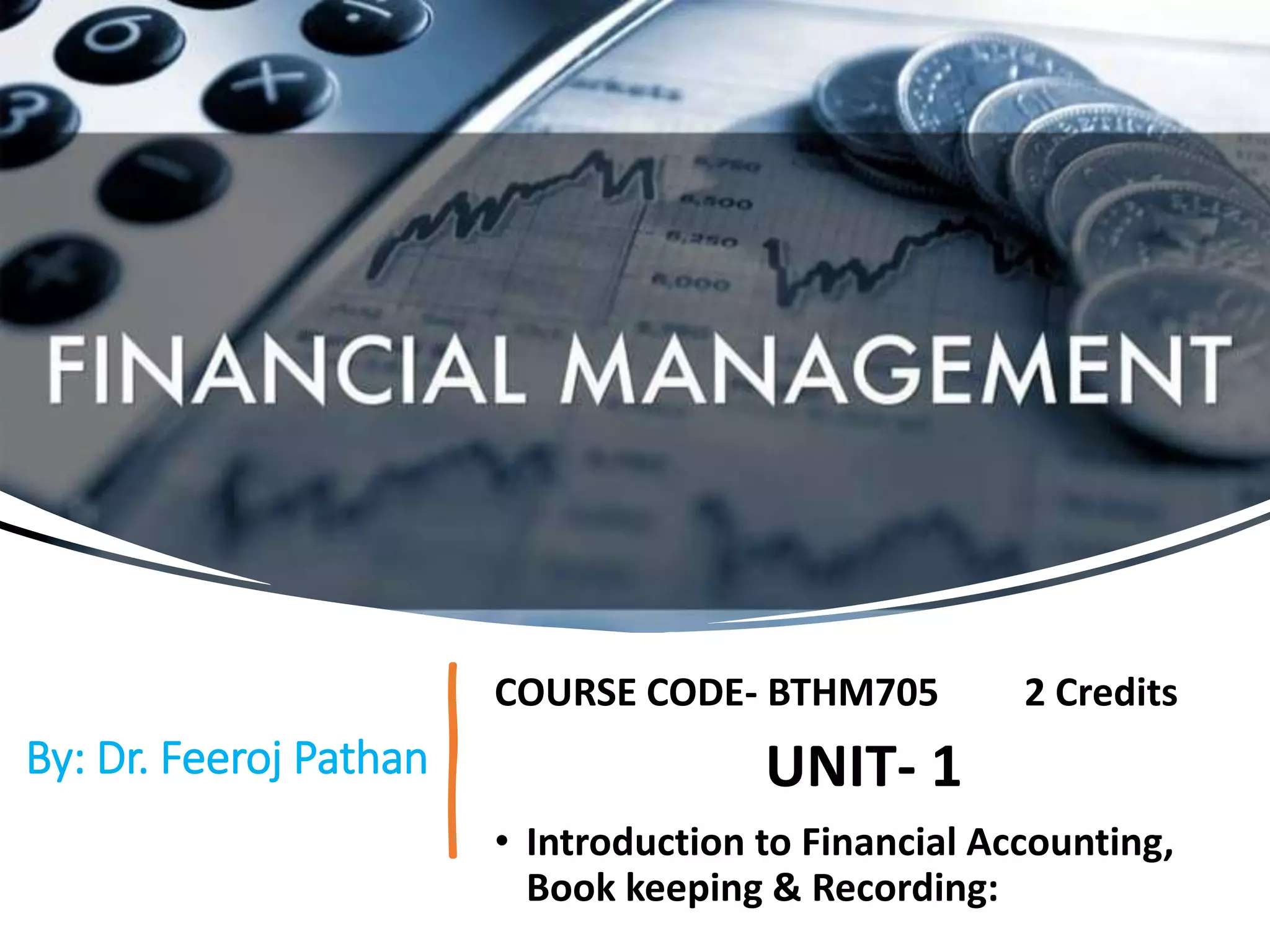 The document outlines a course on financial accounting, emphasizing the importance of financial management and corporate valuation. It covers fundamental accounting principles, methods of accounting, and types of accounts while explaining the preparation and analysis of financial statements like the balance sheet and profit & loss account. The course aims to equip students with the skills to analyze financial data, assess risk and return, and make informed financial decisions.