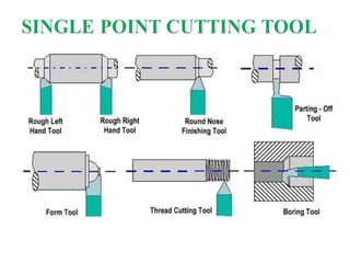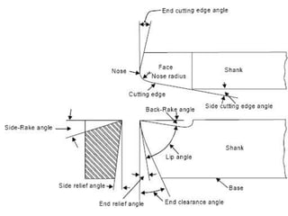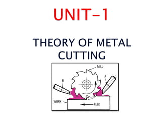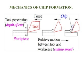 This document discusses the theory and mechanics of metal cutting. It begins by defining metal cutting as removing unwanted material from a workpiece through cutting, abrasion, or non-traditional processes. It then covers the basics of orthogonal and oblique metal cutting, tool geometry including rake and relief angles, and different types of chips that can form. The document also discusses important considerations for metal cutting like cutting speed, feed rate, depth of cut, and tool materials commonly used including high-speed steel, cemented carbides, and ceramics.