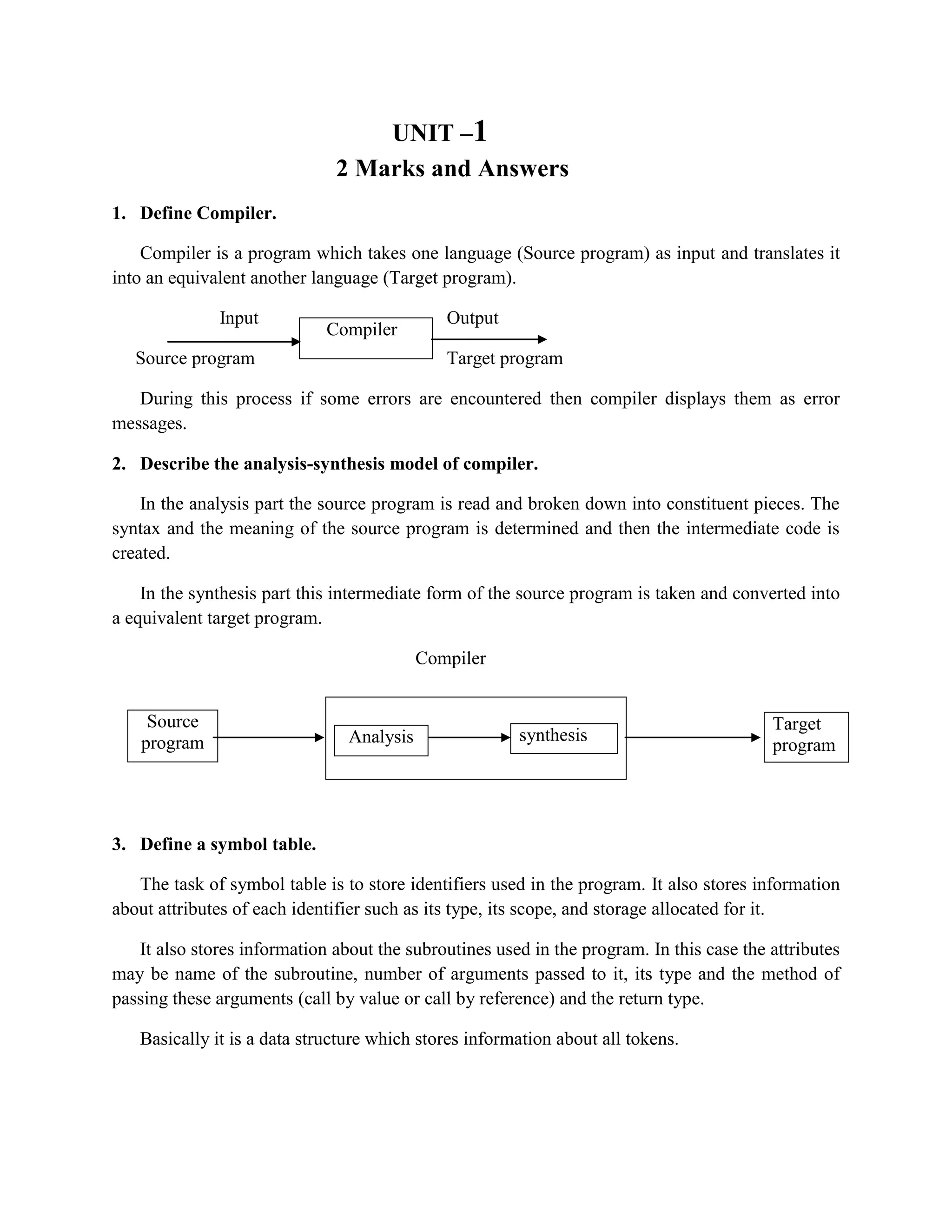 1. A compiler translates a source program into an equivalent target program and detects errors. It performs analysis and synthesis.