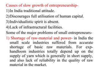 This document discusses entrepreneurship development and factors influencing entrepreneurship in India. It covers definitions of entrepreneur and entrepreneurship, characteristics and functions of entrepreneurs, theories of entrepreneurship like McClelland's theory of psychological needs and Max Weber's theory on religion and culture. It also discusses problems faced by small entrepreneurs like shortage of raw materials, financing, technology and marketing difficulties. Social and economic factors influencing entrepreneurship in India are discussed such as government policies, availability of infrastructure, institutions, family background and social status.