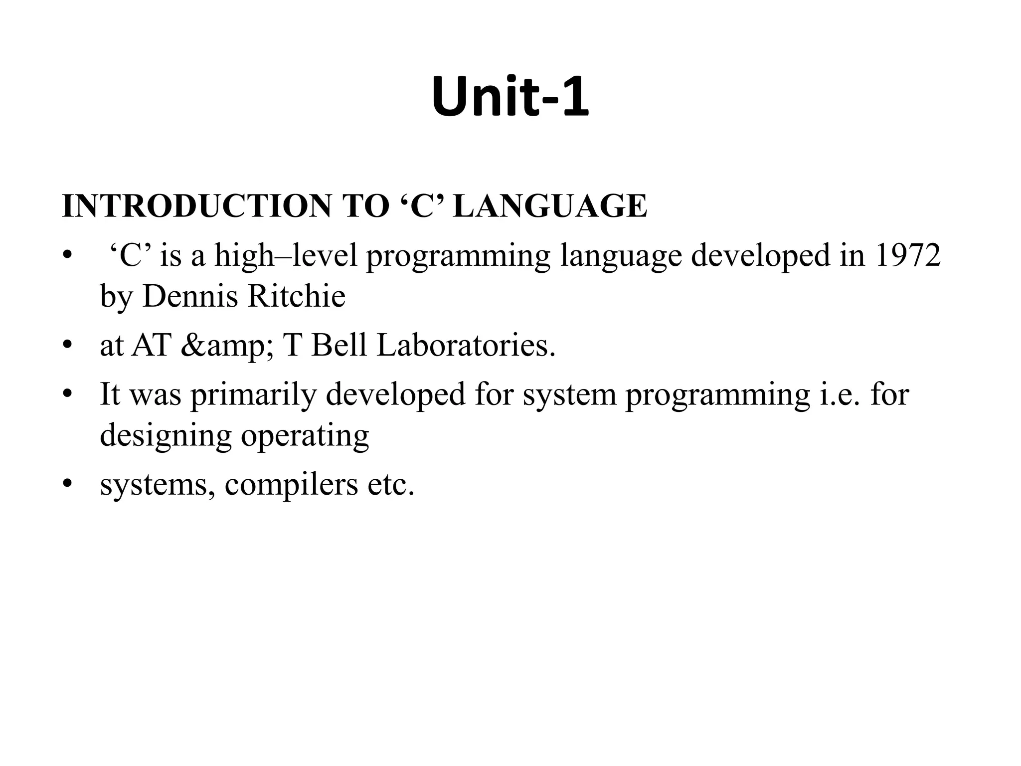 The document provides an introduction to the C programming language including its history, importance, basic structure, and key concepts. It was developed in 1972 by Dennis Ritchie at Bell Labs. C is a high-level language well-suited for system programming like operating systems and compilers. The basic structure of C programs includes sections for documentation, headers, preprocessor directives, global declarations, the main function, and subprograms. The document also discusses C tokens, variables, data types, input/output functions, and assignment statements.