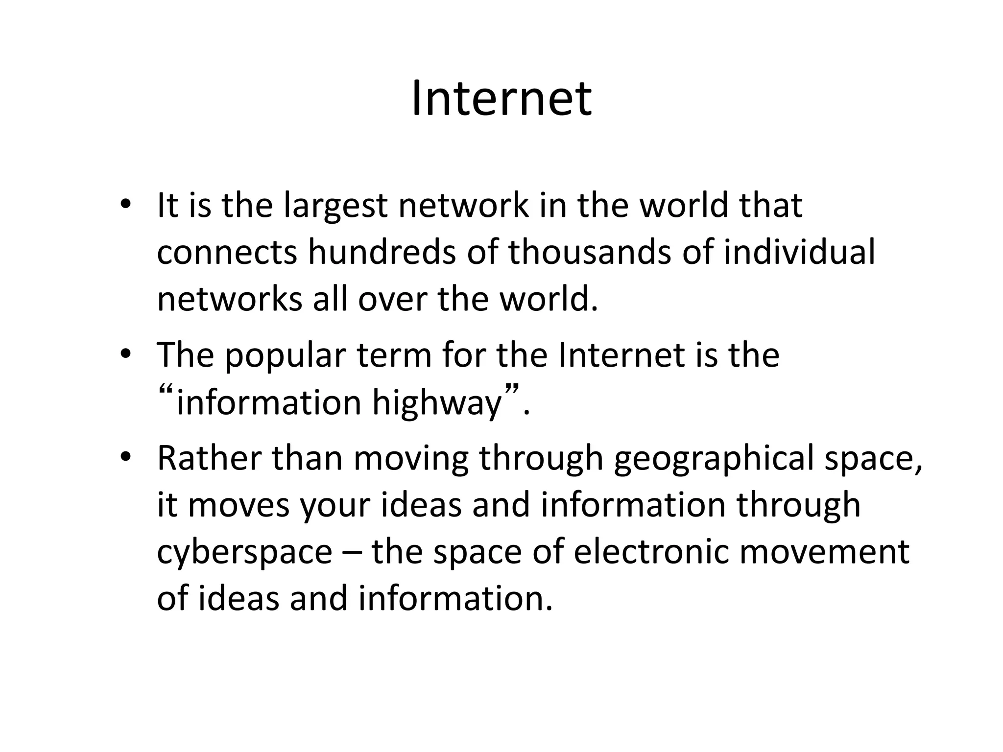 The document provides an overview of the internet, describing it as a vast network of interconnected networks that allows data exchange across the globe using protocols like TCP/IP. It details the structure and functionality of internet protocols, addressing schemes (IP addresses and domain names), and various methods of connecting to the internet such as dial-up, DSL, and satellite connections. Additionally, it explains the World Wide Web, highlighting how web browsers function with HTML documents and the process of searching for information online.