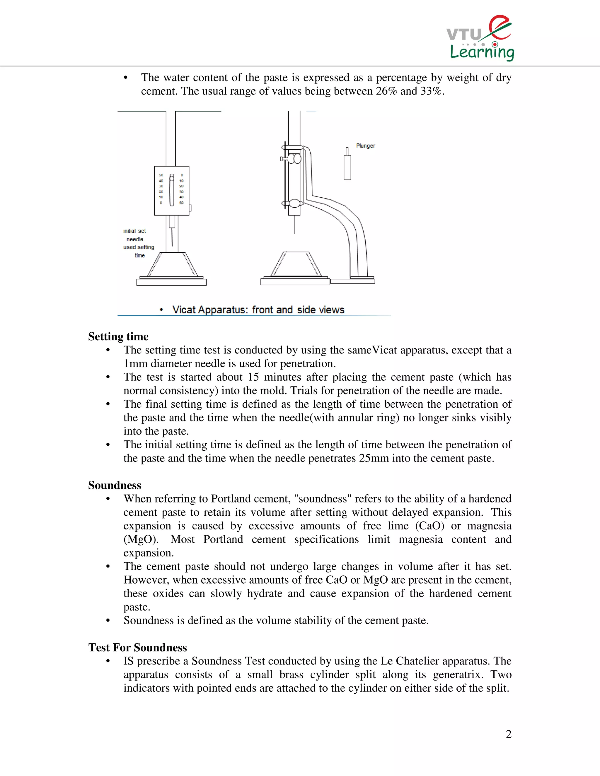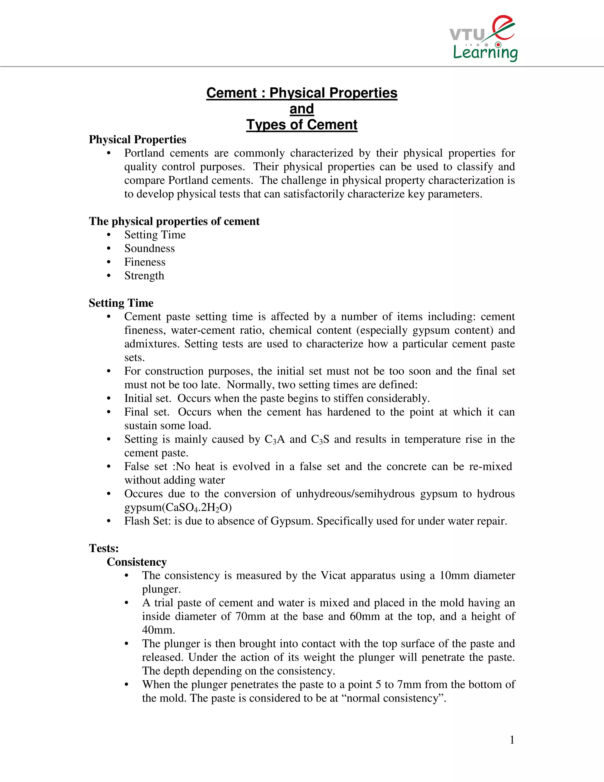 Cement has various physical properties that are important for quality control, including setting time, soundness, fineness, and strength. Standard tests are used to characterize these properties according to specifications. Setting time refers to initial and final set, which are affected by factors like fineness and chemical composition. Soundness ensures volume stability after hardening. Fineness impacts hydration rate and strength gain. Strength is typically measured via compression, tension, or flexion tests at various ages. Different types of cement are produced through adjustments to raw materials, chemical proportions, additives, and grinding degree.