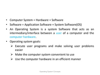 The document provides an overview of operating system concepts, including definitions of an operating system, its functions, and different types of systems. It discusses mainframe systems using simple batch and multiprogramming operating systems. It also covers time-sharing/multitasking systems, desktop systems, and multiprocessor/parallel systems. The key functions of an operating system are described as process management, memory management, file management, device management, and security.