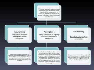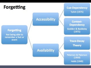 The document provides information about an upcoming psychology exam, including its length, structure, and marking scheme. It also defines key terms like studies and theories, and provides guidelines for describing and evaluating studies. Specific studies discussed include Craik and Tulving's 1975 experiment demonstrating better recall of words processed semantically versus structurally or phonetically. Memory and forgetting are defined in relation to encoding, storage and retrieval. Several memory theories are also outlined, such as the multi-store model, levels of processing theory, trace decay theory, and cue-dependent theory.