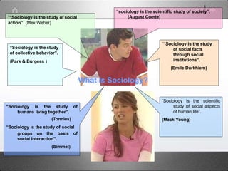 This document provides an overview of the origins and development of sociology. It discusses the early theorists who studied and defined sociology, including Auguste Comte who is considered the founder of modern sociology. It also covers key thinkers and ideas that shaped sociology such as Marx and the concept of class conflict, Durkheim and mechanical versus organic solidarity, and Weber's ideas of verstehen and rationalization. The document traces how sociology emerged in Europe and was influenced by industrialization and the desire to scientifically study changing social conditions.