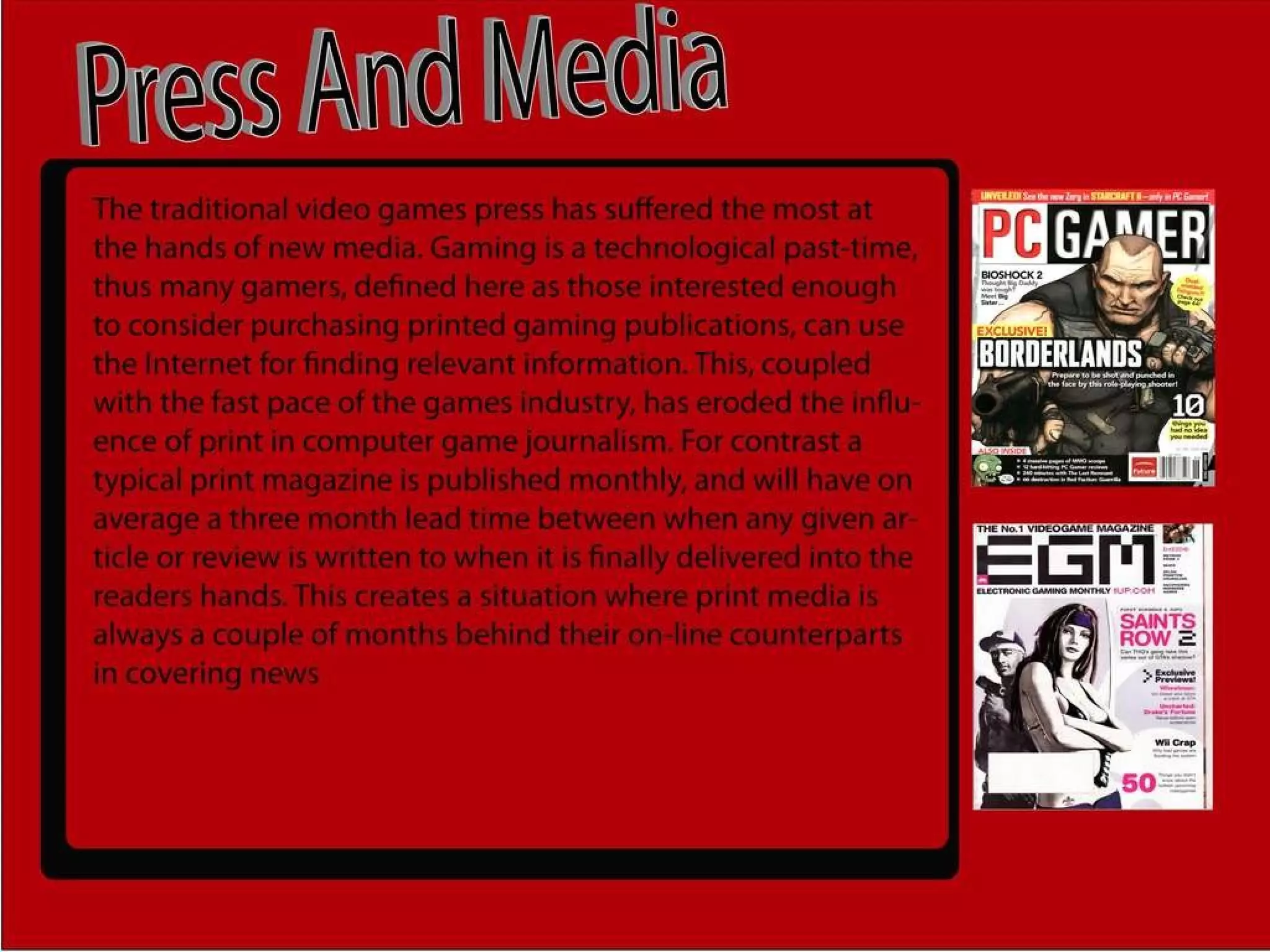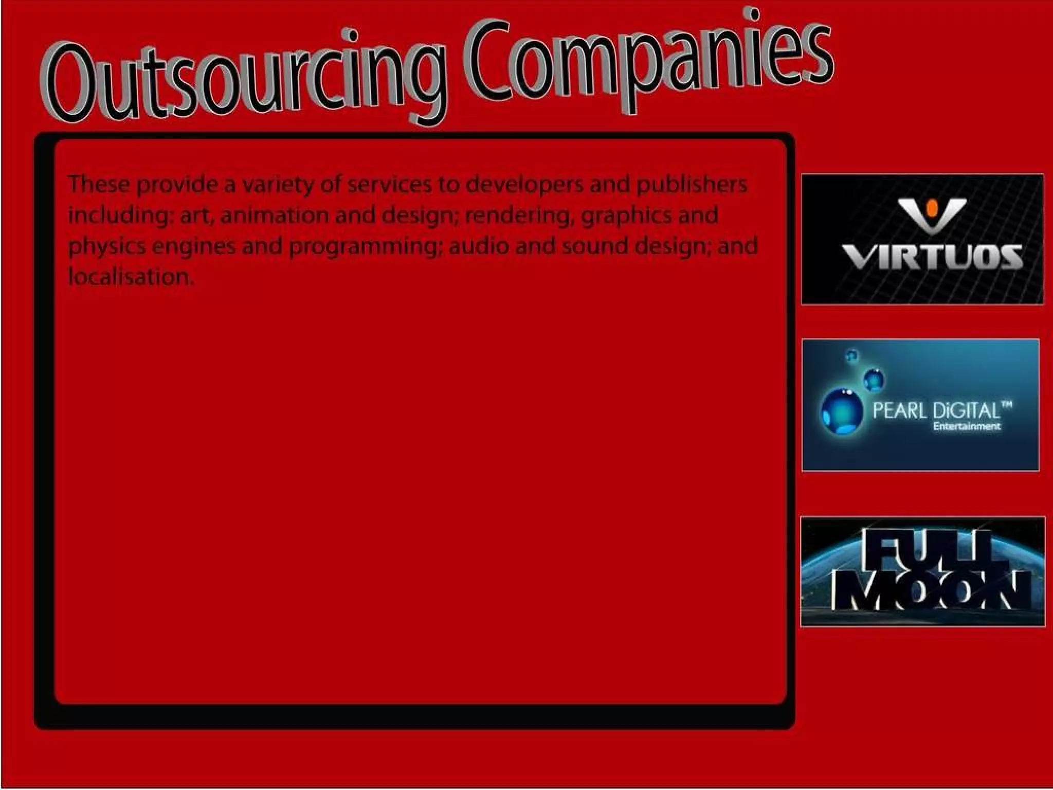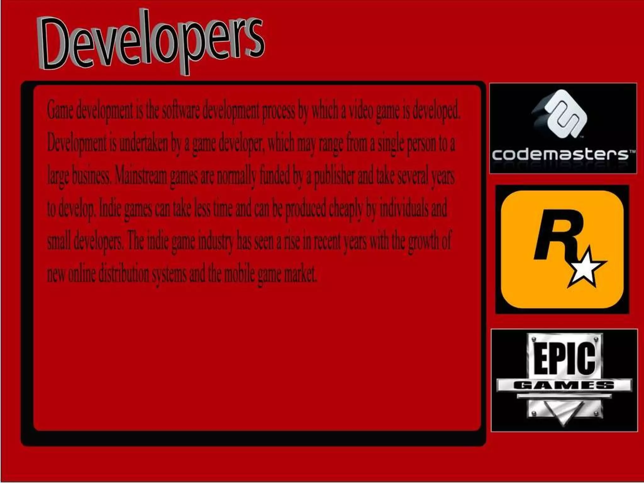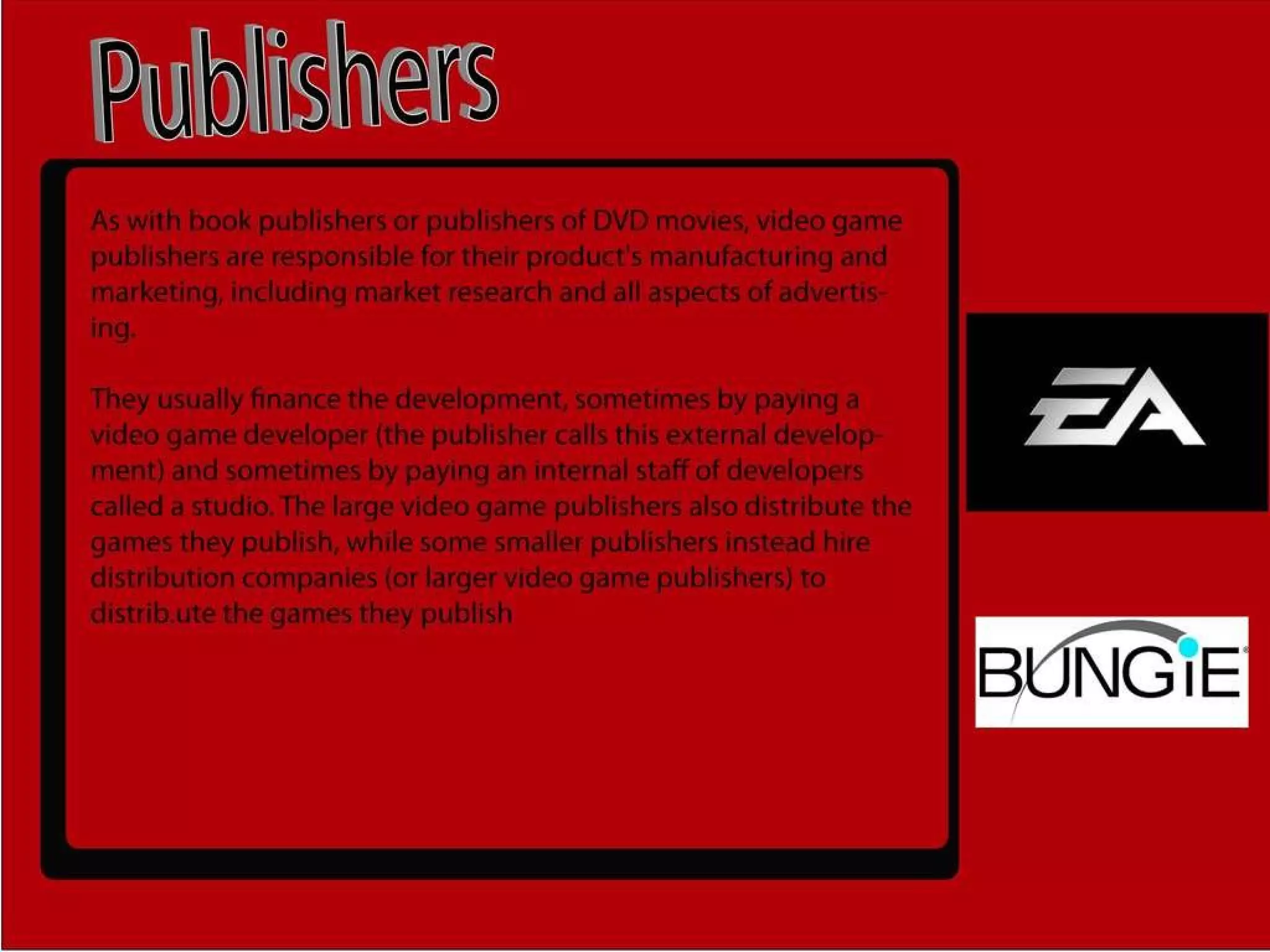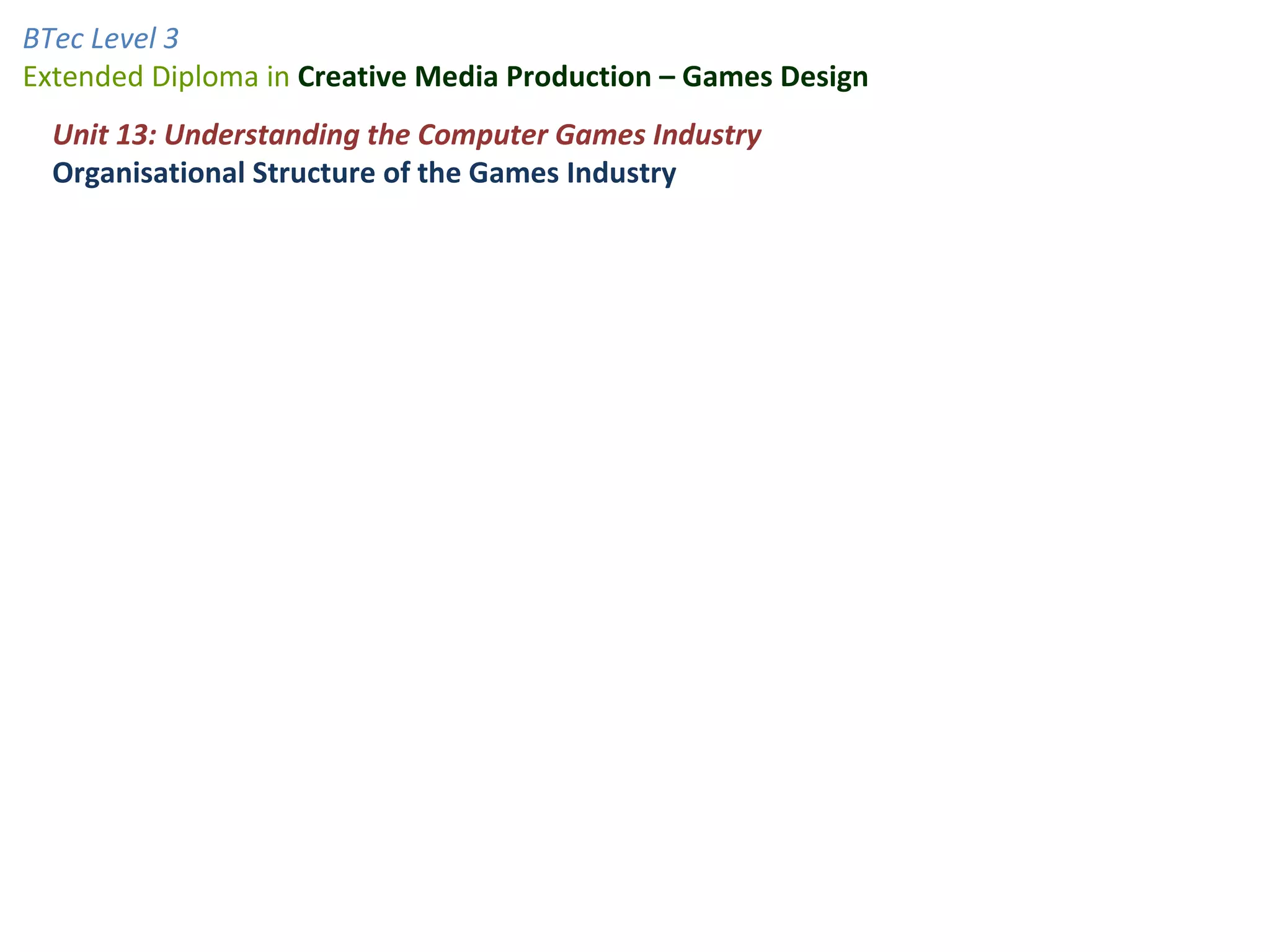The games industry has a complex organizational structure to develop video games. Large game companies have different departments that each focus on a specific part of the development process like programming, art, design, and testing. Smaller indie game studios have much smaller teams that may involve only a handful of people taking on varied roles from programming to art to marketing.