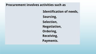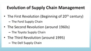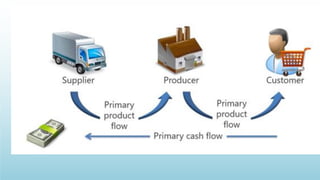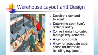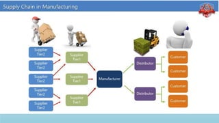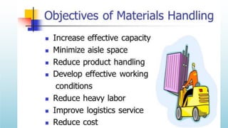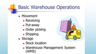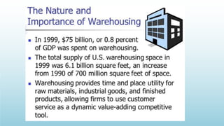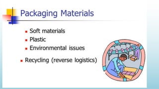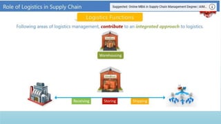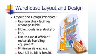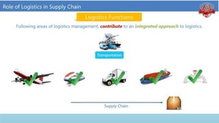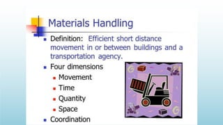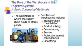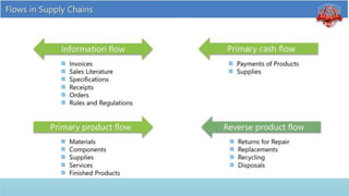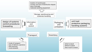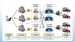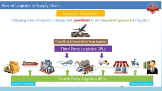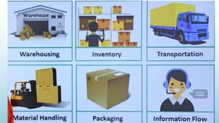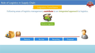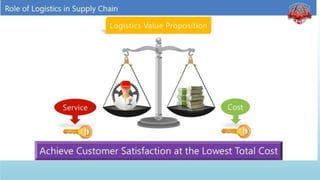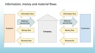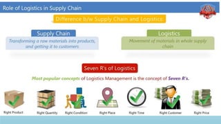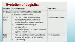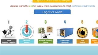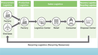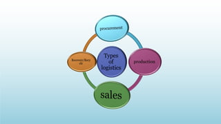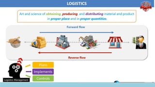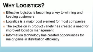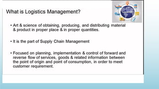 Logistics management is the planning, implementation, and control of efficient product flow from the point of origin to the point of consumption to meet customer requirements. It involves procurement, production, and sales logistics as well as reverse logistics. The key components of logistics include transportation, warehousing, inventory management, material handling, and information flow. Effective logistics is important for businesses as it allows getting the right products to the right customers at the right time and place.