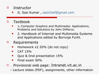 This document provides information about the CSE 402 course Introduction to Computer Graphics taught by Professor G. Sasi Kumar. The course will cover fundamental concepts of computer graphics through lectures and assignments. Students will be evaluated based on homework, a midterm exam, quizzes and presentations, and a final exam. Reference materials for the course include textbooks and literature on the history and applications of computer graphics.