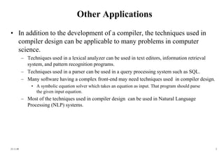 A compiler is a program that translates a program written in a source language into an equivalent program in a target language. It has two major parts - analysis and synthesis. In analysis, an intermediate representation is created by analyzing the lexical, syntactic and semantic properties of the source program. In synthesis, the target program is created from the intermediate representation through code generation and optimization. The major techniques used in compiler design like parsing and code generation can also be applied to other domains like natural language processing.