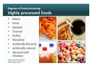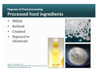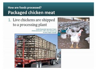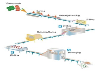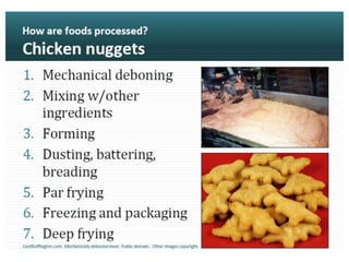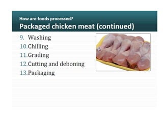 The document provides an overview of food technology and processing in India. It discusses that the Indian food processing industry was valued at €92 billion in 2005 and has attracted €790 million in foreign direct investment. It then provides details on the production levels of various foods in India like milk, fruits and vegetables, food grains, fish, poultry and eggs. It notes that processing levels for these foods are quite low, around 2-35%. The document then discusses the processing of specific foods like fruits and vegetables, meat, dairy, fish and consumer food industries. It provides statistics on the growth and investments in these industries.