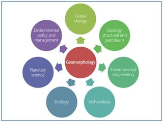 - Geomorphology is relevant to fields like geology, engineering, archaeology and