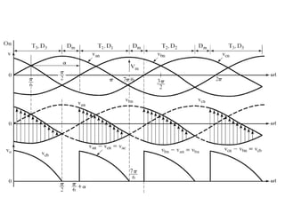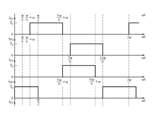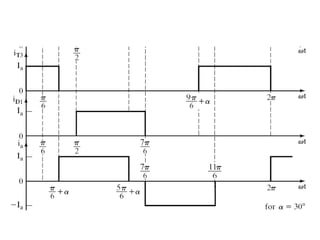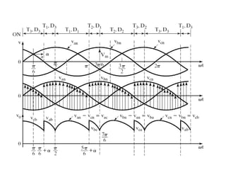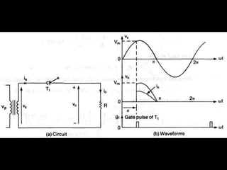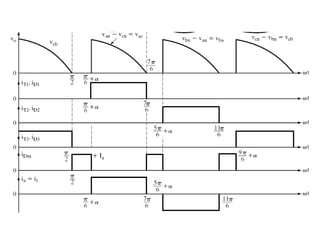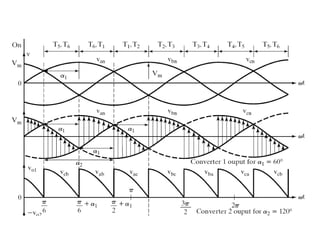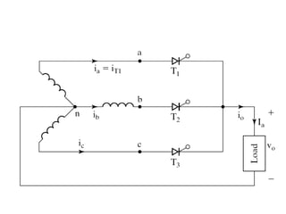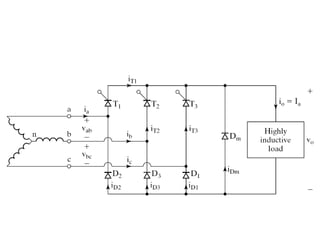 This document discusses different types of phase controlled converters including single-phase and three-phase semiconverters, full converters, and dual converters. It provides equations and diagrams to describe the operation and analyze the performance of single-phase semiconverters and full converters with resistive-inductive loads. It also describes the operation of a three-phase half-wave converter with continuous and constant load current.