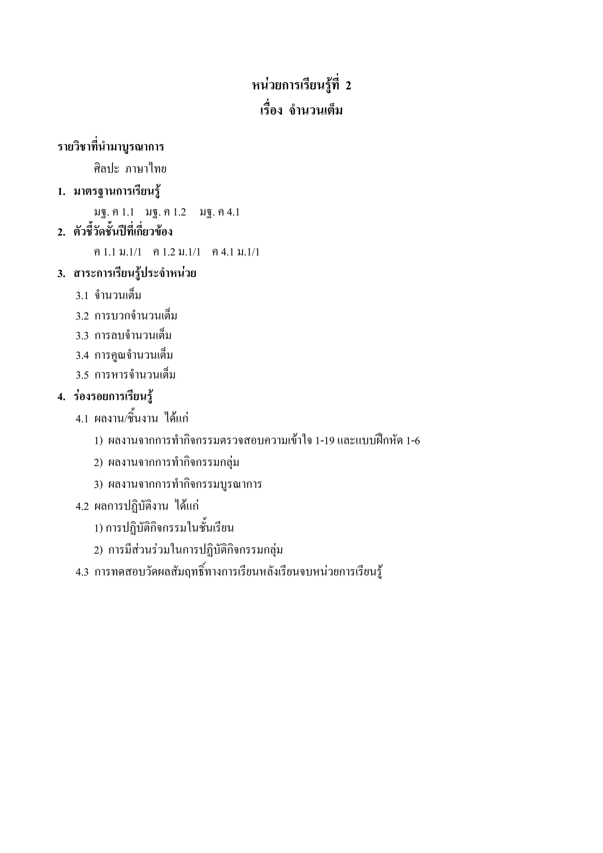 1 51 3. รองรอยการเรียนรู 3.1 ผลงาน/ชินงาน ้ 1) ผลงานจากการทํากิจกรรมตรวจสอบความเขาใจ 10-13 และแบบฝกหัด 2 และ 3 2) ผลงานจากการทํากิจกรรมกลุม 3.2 กระบวนการขั้นตอนการปฏิบัตงานิ 1) จัดกลุม กลุมละ 3 คน 2) เลือกหัวหนากลุม 3) หัวหนากลุมแบงงาน 4) รวมกันทํากิจกรรมตรวจสอบความเขาใจ 5) นําเสนอผลงานหนาชั้นเรียน 6) สงงาน 3.3 พฤติกรรมตามคุณลักษณะพึงประสงค 1) ใหความรวมมือในการทํางานกลุม 2) มีความละเอียดรอบคอบและรับผิดชอบในการทํางาน 3.4 ความรูความเขาใจ นักเรียนเขาใจความหมายและลักษณะของการบวกจํานวนเต็มไดอยางถูกตอง 4. แนวทางการวัดผลและประเมินผล เกณฑผานขั้นต่ํา 1) ไดระดับ “พอใช” ขึ้นไป 2) ไดระดับ “ดี” ขึ้นไป 3) ทําไดถูกตอง 80% ขึ้นไป การสรุปผลการประเมิน ตองผานเกณฑขั้นต่ําทั้ง 3 รายการ