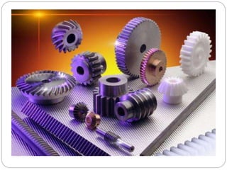 The document provides information on spur gears, including definitions, types, classifications, terminology, design procedure, materials, and manufacturing methods. Some key points: