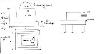The document discusses the design and construction of machine foundations, which are crucial for supporting machines subjected to dynamic forces. It outlines types of machine foundations, their suitability based on machine type, and codes of practice (IS 2974) for various foundation types. Additionally, it details criteria for foundation design, methods of analysis, guidelines for sizing, and construction materials necessary for effective vibration control and structural integrity.