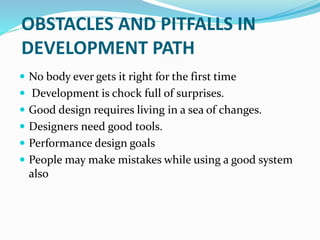 The document discusses human-computer interaction design. It notes that good design requires understanding users, their needs and expectations. Common pitfalls include lack of early user analysis, usability testing and team communication. Ambiguous interfaces, limited input and complex navigation cause usability problems. The design process involves understanding business functions, human characteristics like memory and speed, and ensuring the interface matches users' mental models through techniques like task analysis and conceptual modeling.