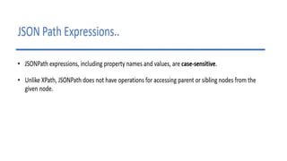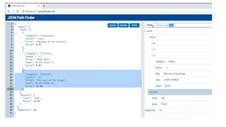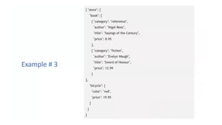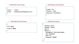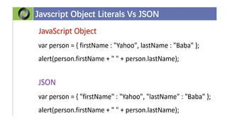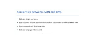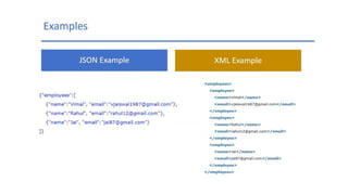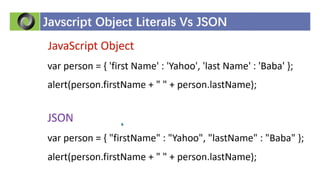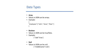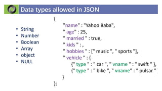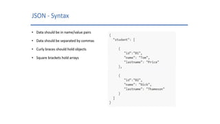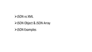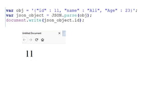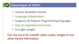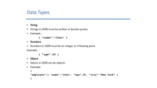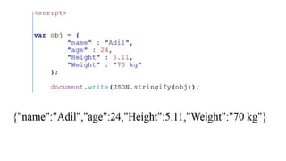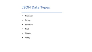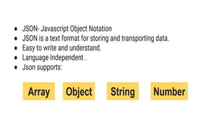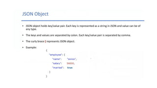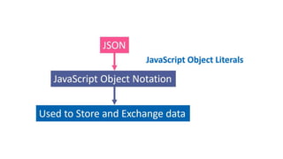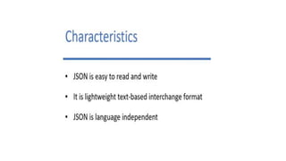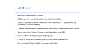 This document discusses JSON (JavaScript Object Notation), its uses, characteristics, data types, syntax, and how to convert JavaScript objects to and from JSON strings using the JSON.stringify() and JSON.parse() methods. It provides examples of using these methods to serialize a JavaScript object to a JSON string for transmission to a server, and to deserialize a received JSON string back into a JavaScript object.