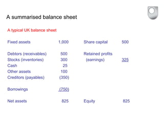 This document provides an overview of balance sheet analysis and calculating return on capital employed (ROCE). It begins with a sample balance sheet and shows how borrowing can be moved to the "funding" side. It then defines the operating and funding sides, and how the operating side aims to earn a return greater than the weighted average cost of capital. The document demonstrates calculating ROCE and breaking it down further. It also discusses asset turnover and its components. Finally, it provides an example calculation and identifies the main driver of a change in ROCE based on the information given.