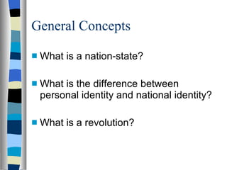 - Key concepts of nation-state, personal vs national identity, and what constitutes a revolution are introduced.