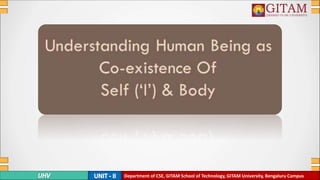 The document repeatedly lists the Department of CSE, GITAM School of Technology, GITAM University, Bengaluru Campus. It also contains a brief statement about living in harmony with others and trying to live peacefully with ourselves and those around us.