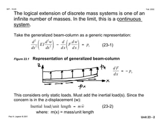 This document discusses the vibration of continuous systems such as beams. It shows that a continuous system can be modeled as having an infinite number of masses. The governing differential equation is derived and solved using normal mode analysis. Normal modes and natural frequencies are determined by applying boundary conditions. The total response is the sum of responses from each normal mode, allowing a continuous system to be treated as uncoupled single-degree-of-freedom systems. Examples are given for a simply supported beam under free and forced vibration.