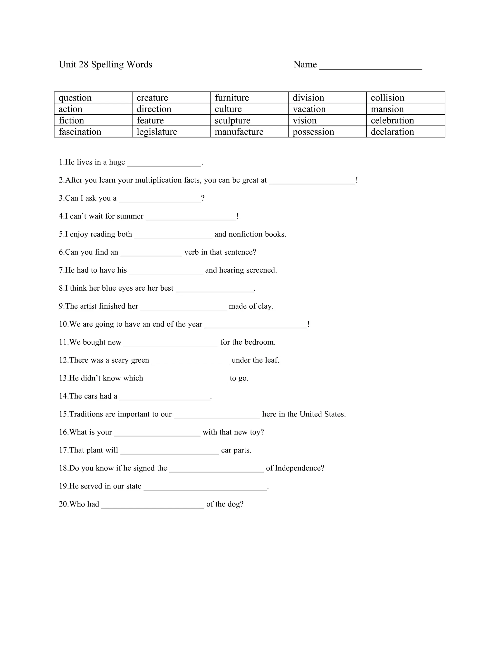 This document provides a list of 20 spelling words for a student to learn, including words like question, creature, furniture, division, and mansion. It also provides 20 sentences for the student to fill in blanks with the appropriate spelling words from the list. The spelling words cover a variety of topics and parts of speech.
