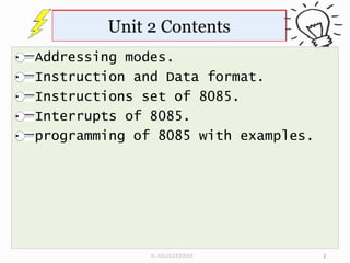 The document discusses the 8085 microprocessor. It covers addressing modes, data formats, instruction sets, interrupts, and provides examples of programming the 8085 microprocessor. It describes one-byte, two-byte and three-byte instructions and categorizes the instruction set. It also defines various symbols used and provides details of data transfer, arithmetic, logic, branch, and machine control instructions.