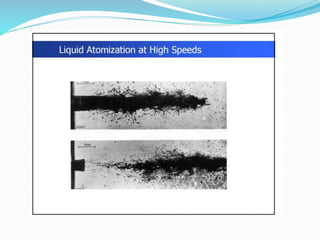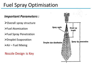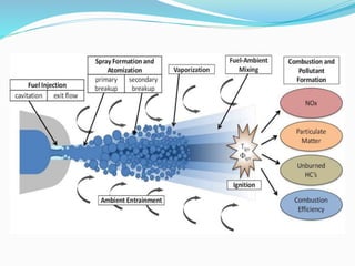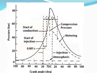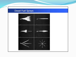 The document discusses diesel fuel injection systems and combustion in compression ignition engines. It covers the stages of combustion (ignition lag, rapid combustion, controlled combustion, after burning), factors that affect ignition delay and knocking, different combustion chamber designs (direct injection, indirect injection), fuel spray behavior, and the role of air motion within the cylinder. Turbocharging is introduced as a way to compress more air into the cylinder before fuel injection, enabling increased power output and efficiency.