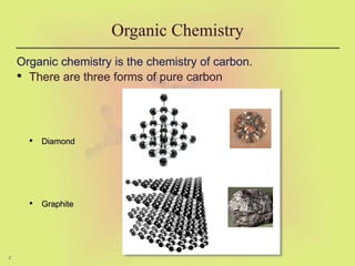 This document provides an overview of organic chemistry concepts including hydrocarbons, functional groups, and several families of organic compounds. It discusses the four families of hydrocarbons - alkanes, alkenes, alkynes, and aromatics. It also examines some functional groups including alcohols, carboxylic acids, and esters. Finally, it analyzes the intermolecular forces between different organic molecule families and how these forces affect physical properties such as boiling points.