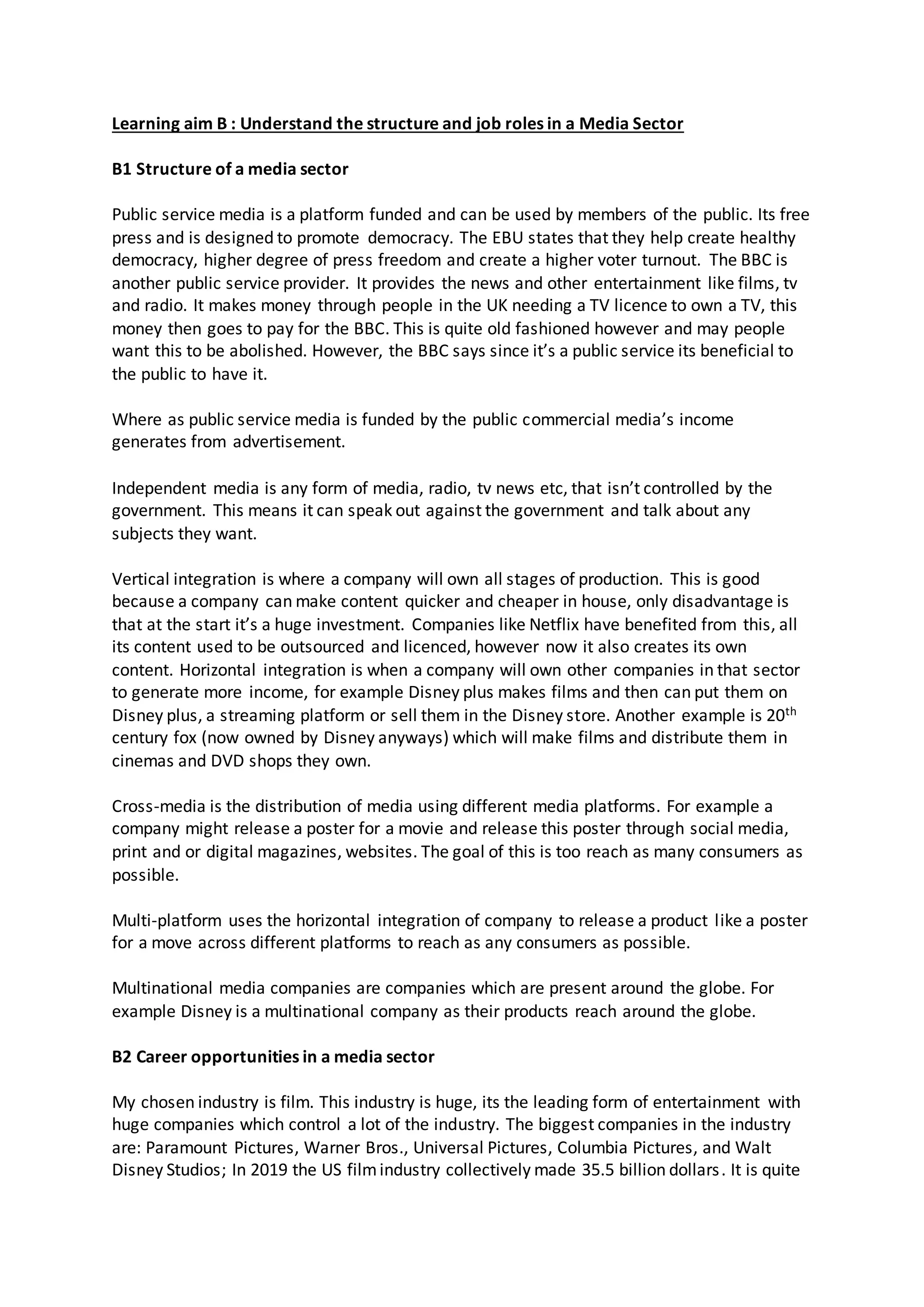 1) The structure includes public service media (funded by the public like the BBC), commercial media (funded through advertising), and independent media (not controlled by the government). It also discusses vertical and horizontal integration where companies own different parts of the production process.