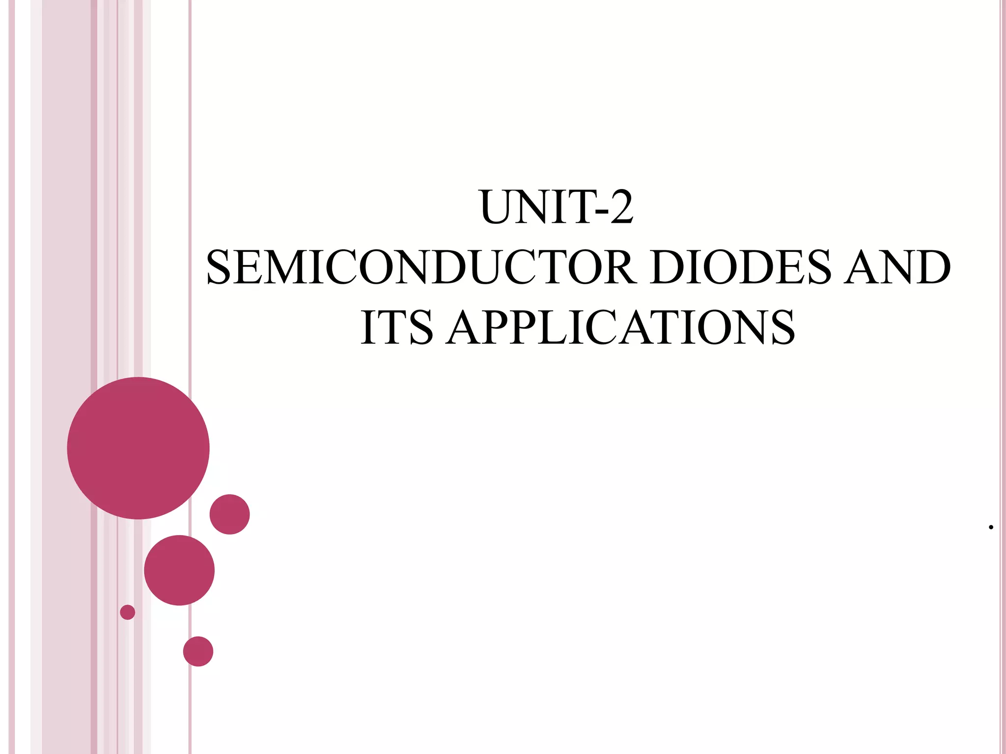 The document discusses semiconductor diodes and their applications. It describes the P-N junction diode, how it allows current to flow in only one direction. A bridge rectifier circuit uses 4 diodes in a bridge configuration to convert alternating current to pulsating direct current. Filter circuits such as 'T' and 'π' filters can be used to create smoother direct current output from the rectified signal. The document also discusses zener diodes and how they can be used as voltage regulators.