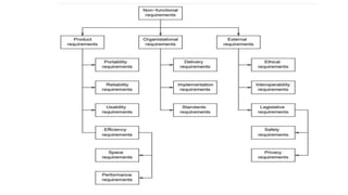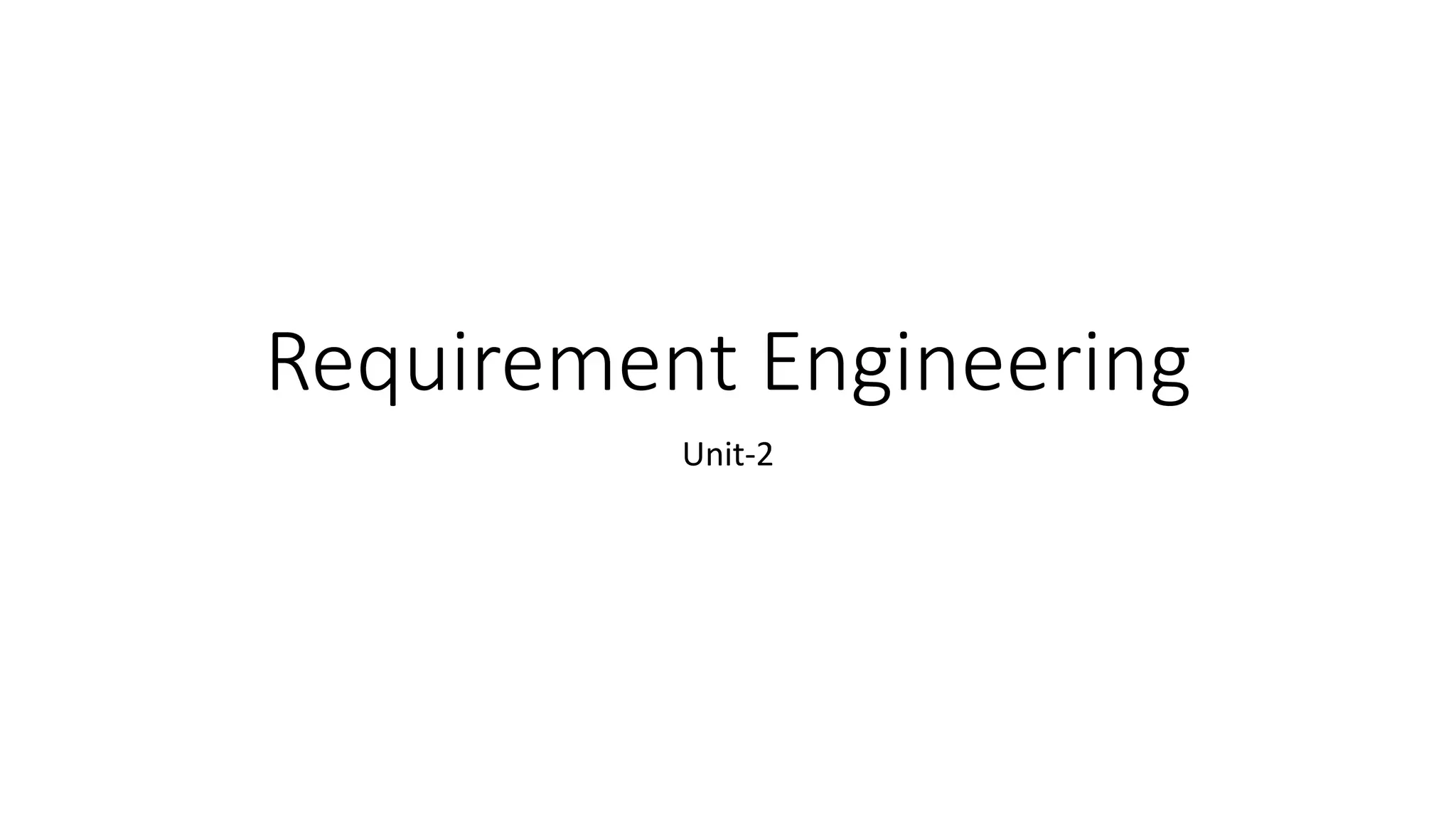 Requirement engineering is the key phase in software development that determines what to build and outlines the quality of the final product. It involves discovering, modeling, documenting, and managing requirements through elicitation, analysis, specification, validation, and management processes. The goal is to develop a system requirements specification document that describes required system functionalities at varying levels of detail, from abstract statements to precise mathematical specifications.
