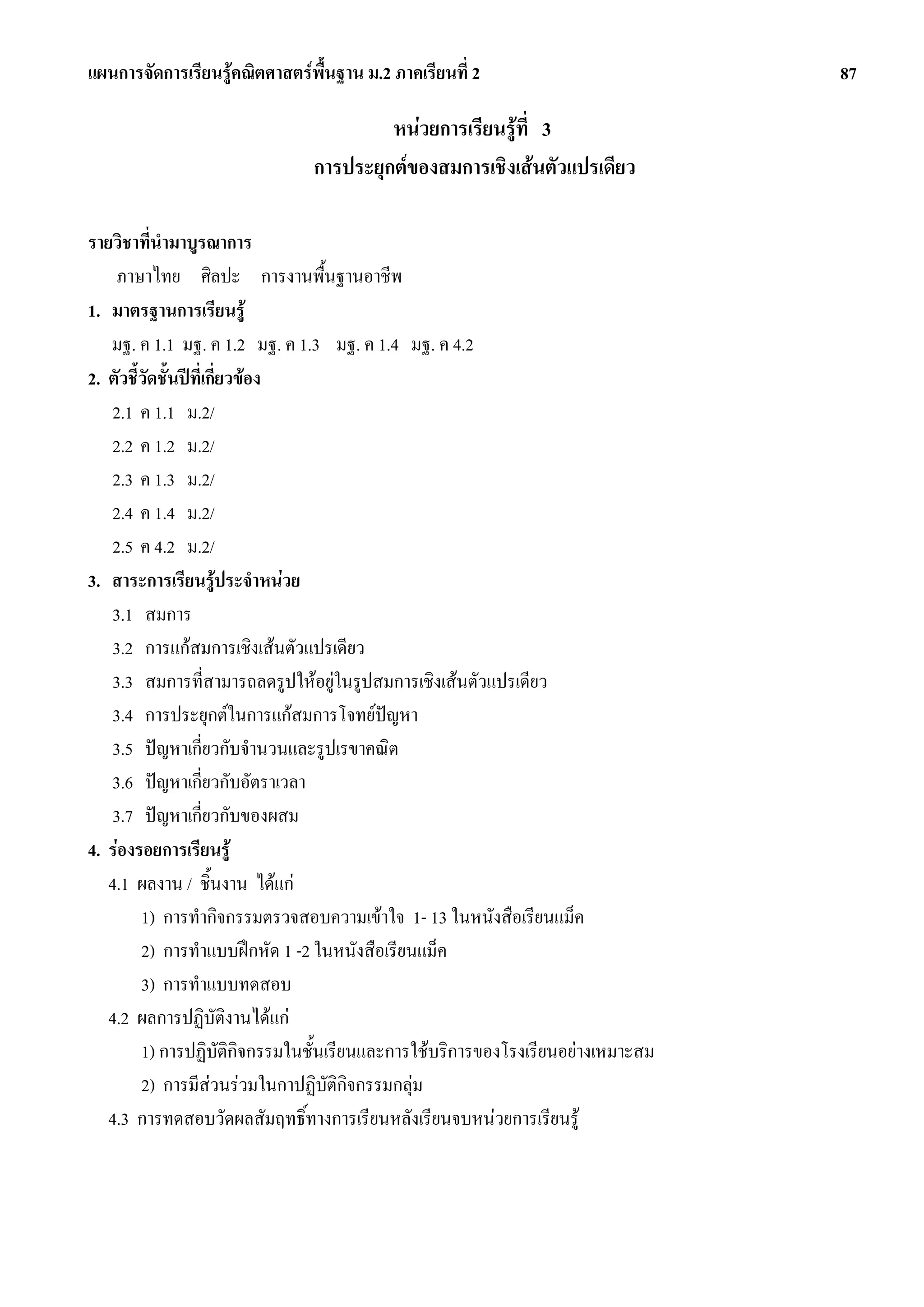 2 87 หนวยการเรียนรูที่ 3 การประยุกตของสมการเชิงเสนตัวแปรเดียว รายวิชาที่นํามาบูรณาการ ภาษาไทย ศิลปะ การงานพื้นฐานอาชีพ 1. มาตรฐานการเรียนรู มฐ. ค 1.1 มฐ. ค 1.2 มฐ. ค 1.3 มฐ. ค 1.4 มฐ. ค 4.2 2. ตัวชี้วัดชั้นปที่เกี่ยวของ 2.1 ค 1.1 ม.2/ 2.2 ค 1.2 ม.2/ 2.3 ค 1.3 ม.2/ 2.4 ค 1.4 ม.2/ 2.5 ค 4.2 ม.2/ 3. สาระการเรียนรูประจําหนวย 3.1 สมการ 3.2 การแกสมการเชิงเสนตัวแปรเดียว 3.3 สมการที่สามารถลดรูปใหอยูในรูปสมการเชิงเสนตัวแปรเดียว 3.4 การประยุกตในการแกสมการโจทยปญหา 3.5 ปญหาเกี่ยวกับจํานวนและรูปเรขาคณิต 3.6 ปญหาเกี่ยวกับอัตราเวลา 3.7 ปญหาเกี่ยวกับของผสม 4. รองรอยการเรียนรู 4.1 ผลงาน / ชิ้นงาน ไดแก 1) การทํากิจกรรมตรวจสอบความเขาใจ 1- 13 ในหนังสือเรียนแม็ค 2) การทําแบบฝกหัด 1 -2 ในหนังสือเรียนแม็ค 3) การทําแบบทดสอบ 4.2 ผลการปฏิบัติงานไดแก 1) การปฏิบัติกิจกรรมในชั้นเรียนและการใชบริการของโรงเรียนอยางเหมาะสม 2) การมีสวนรวมในกาปฏิบัติกิจกรรมกลุม 4.3 การทดสอบวัดผลสัมฤทธิ์ทางการเรียนหลังเรียนจบหนวยการเรียนรู