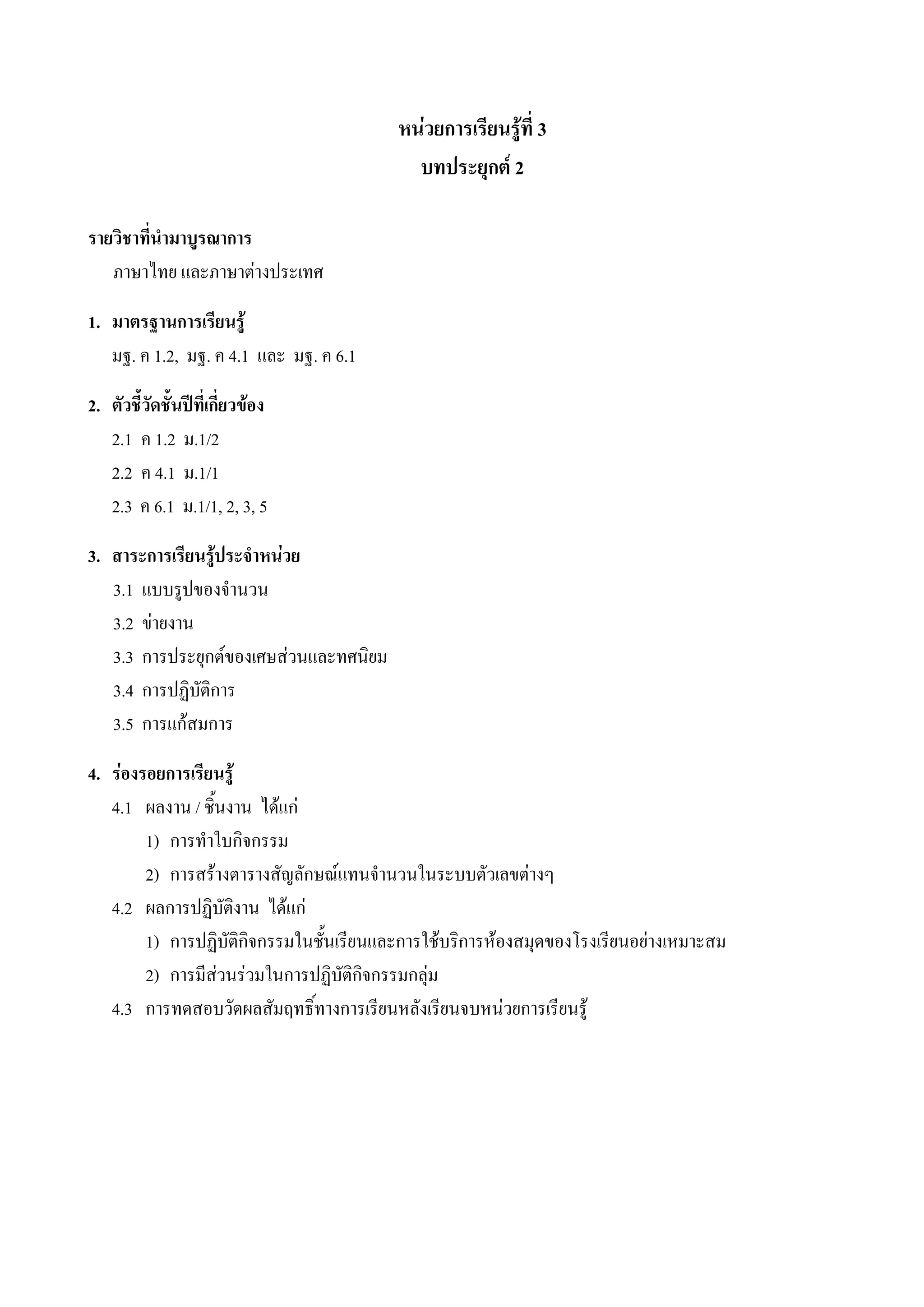บทประยุกต 2 รายวิชาที่นามาบูรณาการ ํ ภาษาไทย และภาษาตางประเทศ 1. มาตรฐานการเรียนรู มฐ. ค 1.2, มฐ. ค 4.1 และ มฐ. ค 6.1 2. ตัวชี้วัดชั้นปที่เกี่ยวของ 2.1 ค 1.2 ม.1/2 2.2 ค 4.1 ม.1/1 2.3 ค 6.1 ม.1/1, 2, 3, 5 3. สาระการเรียนรูประจําหนวย 3.1 แบบรูปของจํานวน 3.2 ขายงาน 3.3 การประยุกตของเศษสวนและทศนิยม 3.4 การปฏิบัติการ 3.5 การแกสมการ 4. รองรอยการเรียนรู 4.1 ผลงาน / ชิ้นงาน ไดแก 1) การทําใบกิจกรรม 2) การสรางตารางสัญลักษณแทนจํานวนในระบบตัวเลขตางๆ 4.2 ผลการปฏิบัติงาน ไดแก 1) การปฏิบัติกิจกรรมในชั้นเรียนและการใชบริการหองสมุดของโรงเรียนอยางเหมาะสม 2) การมีสวนรวมในการปฏิบัติกิจกรรมกลุม 4.3 การทดสอบวัดผลสัมฤทธิ์ทางการเรียนหลังเรียนจบหนวยการเรียนรู