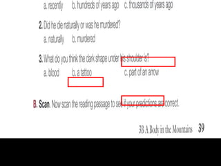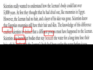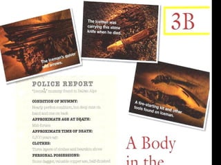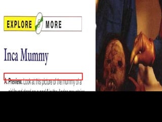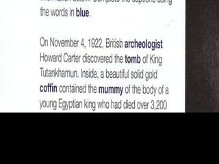 The document discusses theories about how an ancient Egyptian mummy died, including possibilities of murder, injury from war or hunting, or infection from a knee fracture. It also provides vocabulary definitions for words like teenager, luxury, murder, and injury.
