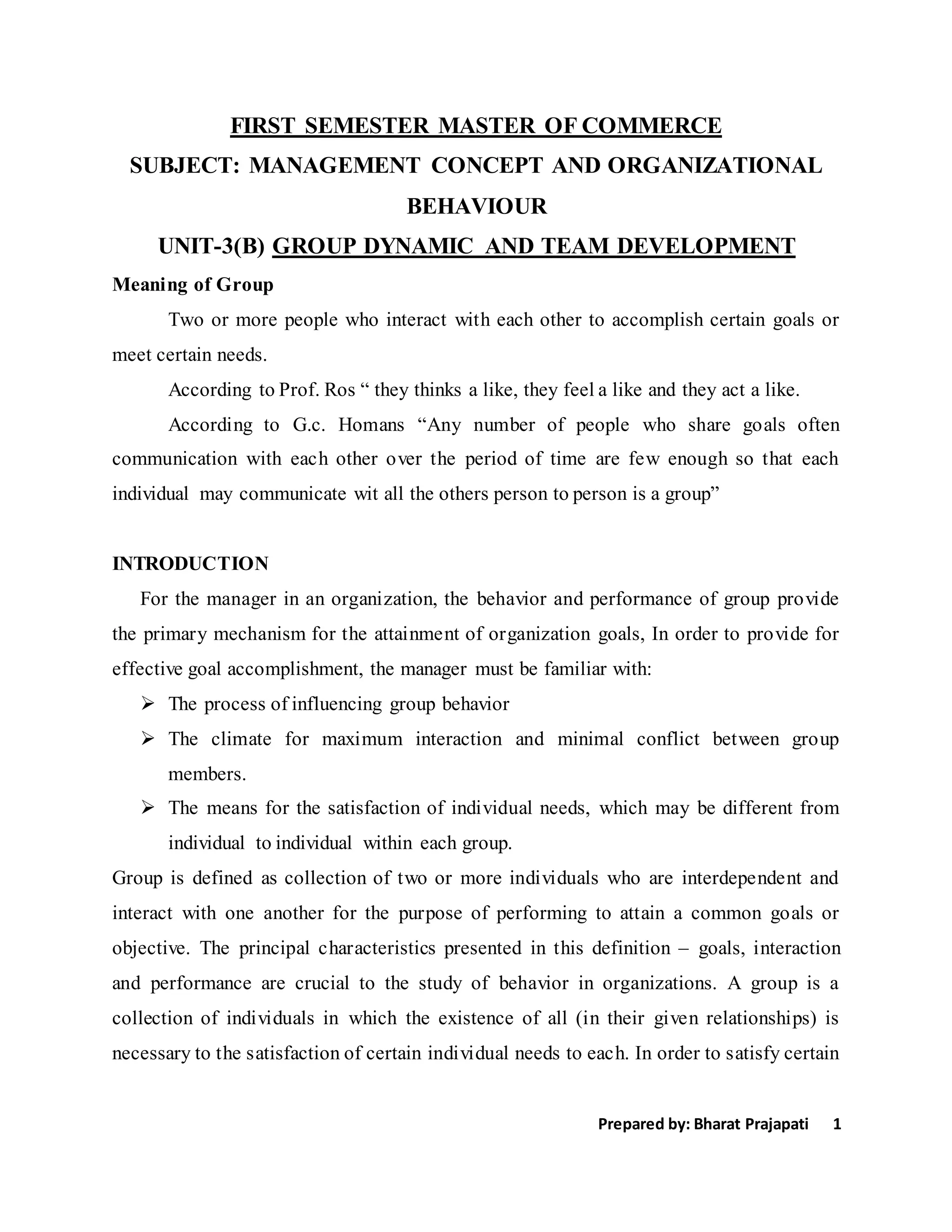 The document discusses group dynamics and team development. It defines groups and teams, explaining that teams require intense work towards a common goal while groups can have looser connections. Several models of group development are presented, including Tuckman's forming, storming, norming, performing, adjourning stages. Key differences between groups and teams include shared leadership and mutual accountability in teams. Types of teams described include problem-solving, self-managed, cross-functional, and virtual teams. Characteristics of effective teams include a clear identity, shared values, complementary roles to achieve goals, clear roles and responsibilities, and participative leadership.