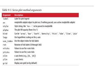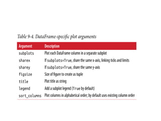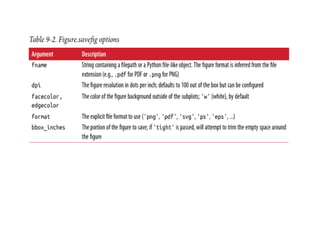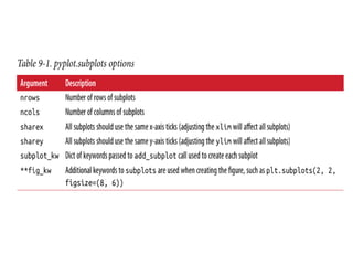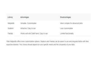 The document provides an extensive overview of data visualization using matplotlib in Python, covering key concepts such as creating plots, customizing axes, and saving figures. It includes practical examples of various types of charts (line, bar, scatter, etc.) and explains the integration of pandas and seaborn for advanced visualizations. Additionally, it addresses annotations, legends, and configuring matplotlib settings to enhance plot aesthetics.