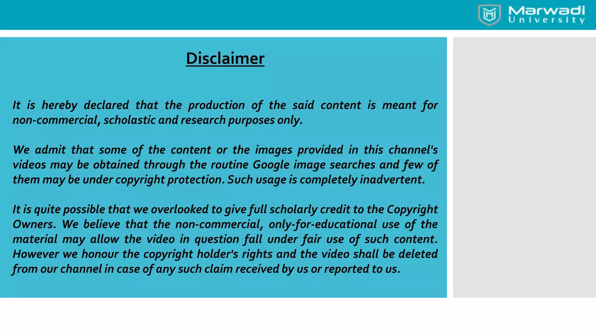 This document provides a disclaimer for content used in a YouTube channel's videos. It states that the content is meant for non-commercial, educational purposes only. It acknowledges that some images used may be under copyright but their use was unintentional and for fair use only. The document says that any copyrighted material will be removed if a claim is received.